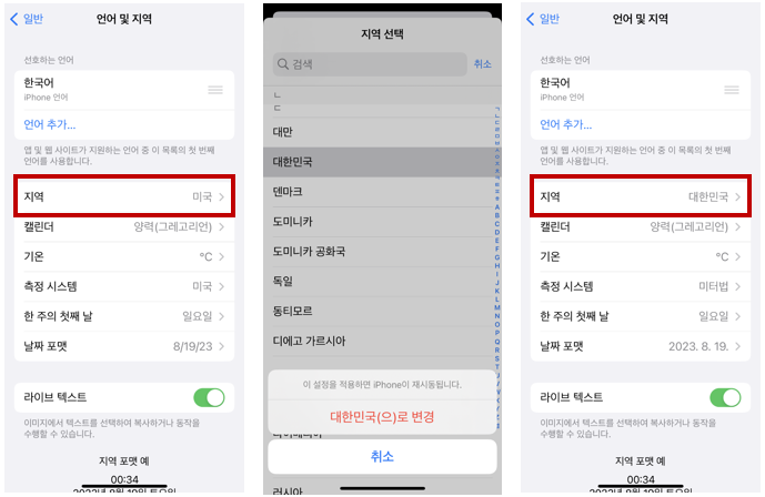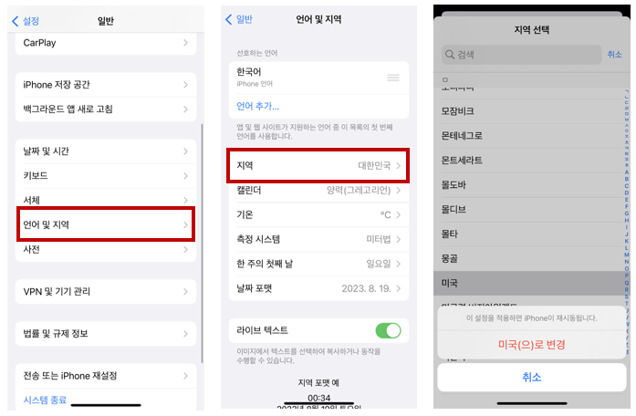 3. 지역을 "미국"으로 변경 했다가, "대한민국"으로 다시 변경합니다.