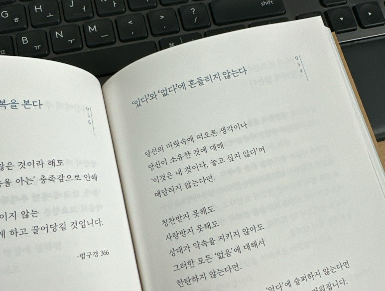 이번에 읽은 책은 복잡한 불교 교리를 쉽게 풀어내어, 일상에서 마음의 평온과 깨달음을 얻을 수 있도록 도와줍니다. 부처님의 말씀을 짧고 간결한 형태로 초역한 책으로 누구나 쉽게 접근할 수 있게 한장, 한장으로 구성되어 있습니다. 아무때나 아무 페이지를 열어서 보면 좋은 형태로 구성되어 있습니다. 년초부터 맘이 무겁고 힘들었는데 위로가 되는 책 중 하나입니다.