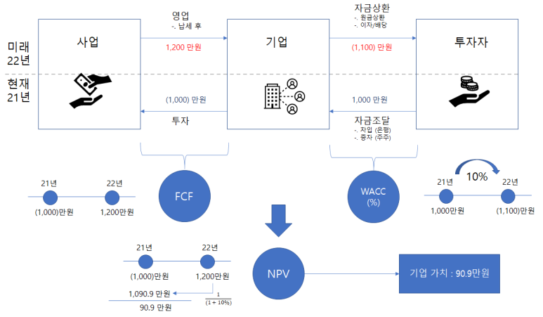 기업 가치란, 기업활동을 통해 창출되는 현재 시점의 가치이며 이는 순현재가치 (NPV)와 정확하게 일치하게 됩니다. 즉, 잉여현금흐름(FCF)을 가중평균자본비용(WACC)으로 할인하여 현재 시점의 가치로 환산한 순현재가치(NPV)를 우리는 '기업가치'라고 부르며, 이를 통해 '주식 가치'를 산정할 수 있게 됩니다.